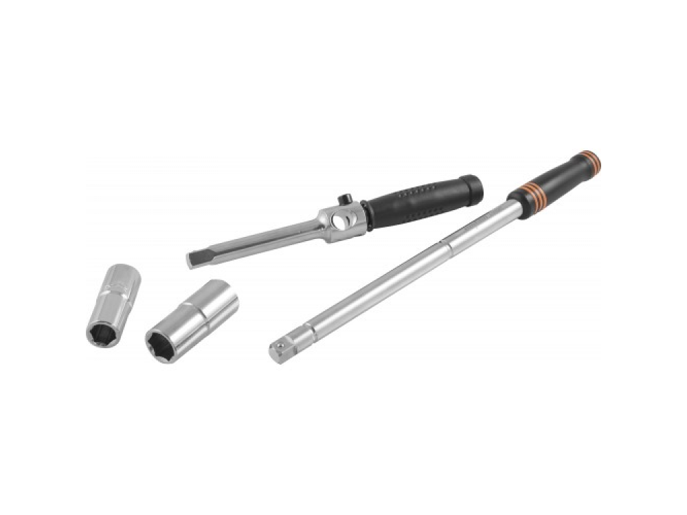 Изделие представляет собой набор, включающий в себя вороток с присоединительным квадратом 1/2"DR для передачи свободного вращения резьбовой детали, удлинитель с рукояткой, используемый при срыве и затяжке соединения. Свободное вращение рукоятки удлинителя в сочетании с воротком, зафиксированным посередине, позволяет использовать инструмент для скоростного обслуживания соединения за счет инерционного момента, две торцевые двусторонние головки с наиболее распространенными рабочими размерами крепежных деталей колес легковых автомобилей - 17/19 и 21/22 мм.